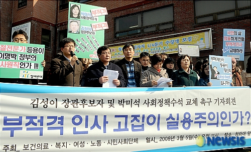 건강연대, 민주노총, 보건의료단체연합, 지역복지단체네트워크, 참여연대, 한국여성단체연합 등 50여 보건의료ㆍ복지ㆍ여성ㆍ노동ㆍ시민사회단체는 5일 청와대 앞에서 기자회견을 개최, 김성이 장관 후보자의 사퇴를 요구했다.