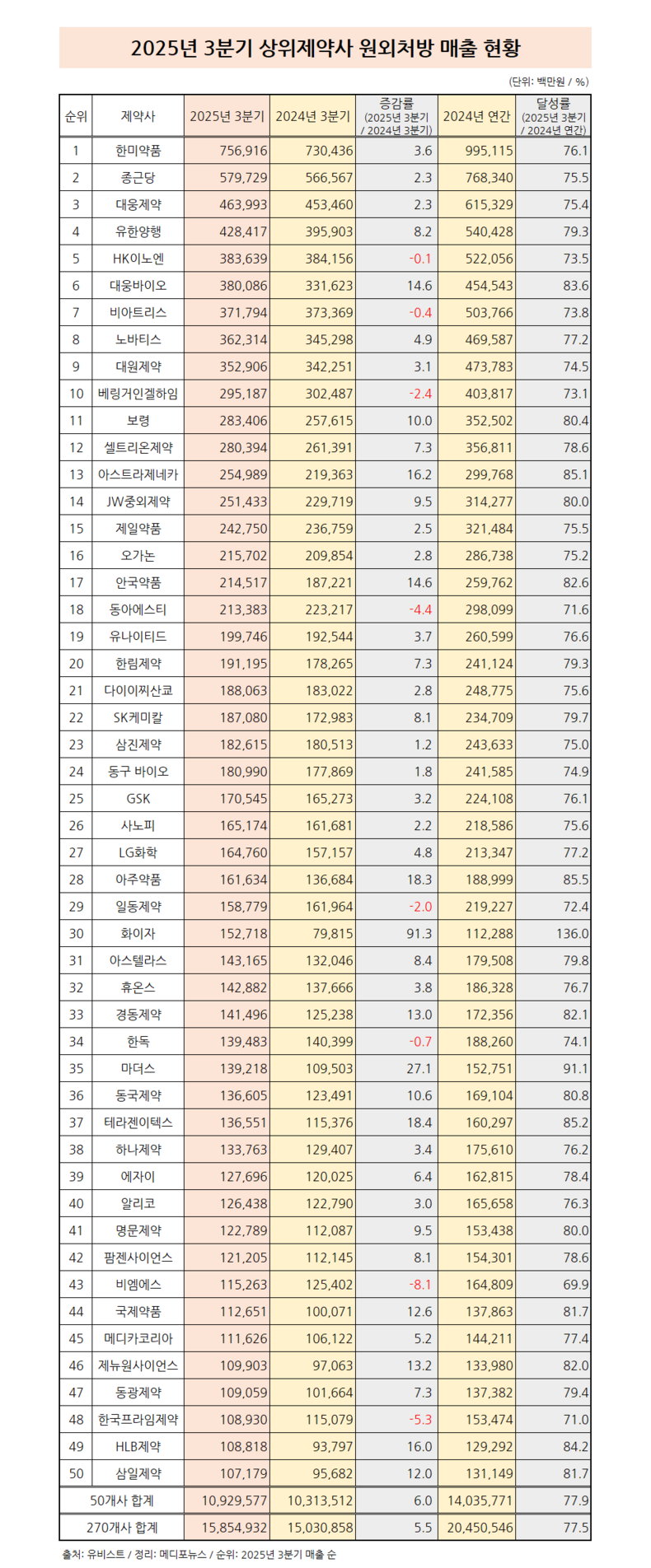 의약품 시장조사기관 유비스트 자료 분석 결과, 2025년 상위 50개사의 원외처방은 10조 9295억원 규모로 2024년 3분기 10조 3135억원 대비 6% 증가했다. 2024년 연간 원외처방액인 14조 357억원 대비 달성률도 77.9%로 평이했다.