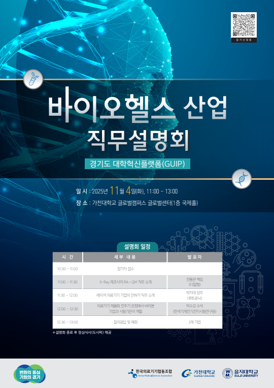 바이오헬스 산업에 관심 있는 대학생들을 위한 ‘바이오헬스 직무설명회’가 오는 11월 4일(화) 오전 11시부터 오후 1시까지 가천대학교 글로벌캠퍼스 글로벌센터 국제홀에서 열린다.