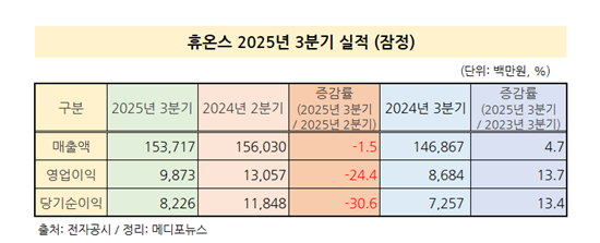 휴온스는 올해 3분기 연결재무제표 기준 매출액 1,537억원, 영업이익 99억원, 순이익 82억원을 달성하며 전년 동기 대비 각각 +4.7%, +13.7%, +13.3% 증가했다고 10일 잠정실적을 공시했다.