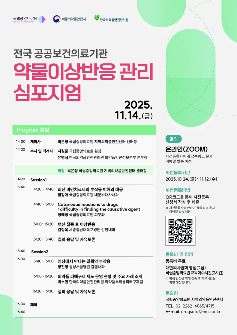 https://forms.gle/2bUbm4ah5of8PoqQA)를 통해 신청할 수 있다. 심포지엄과 관련된 세부내용 및 문의는 국립중앙의료원 지역의약품안전센터 이메일(drugsafe@nmc.or.kr) 또는 전화번호(02-2262-4865, 4715)로 연락하면 된다.