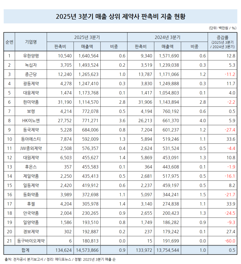 전자공시를 통해 2025년 3분기 매출 상위 30위 이내의 제약사들의 분기보고서를 분석한 결과 총 21개의 제약사들이 판촉비를 공시했다.