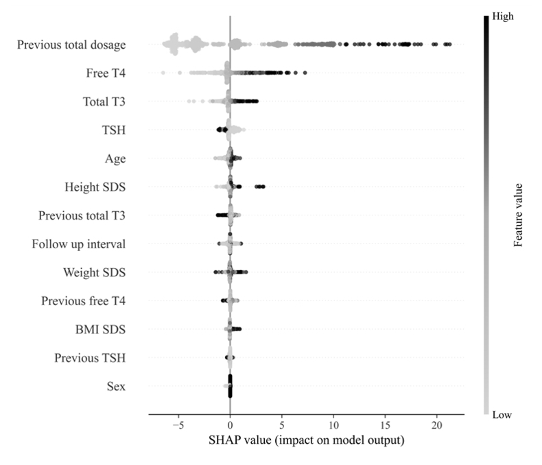 모델 예측에 가장 큰 영향을 미치는 변수는 실제 임상 진료에서 중요하게 생각하는 변수인 ‘이전 처방 용량', ‘유리 T4 호르몬’, ‘혈중 T3 호르몬’ 순으로 나타나, 인공지능 모델이 실제 임상에서의 의사결정 과정을 효과적으로 학습했음을 확인했다.