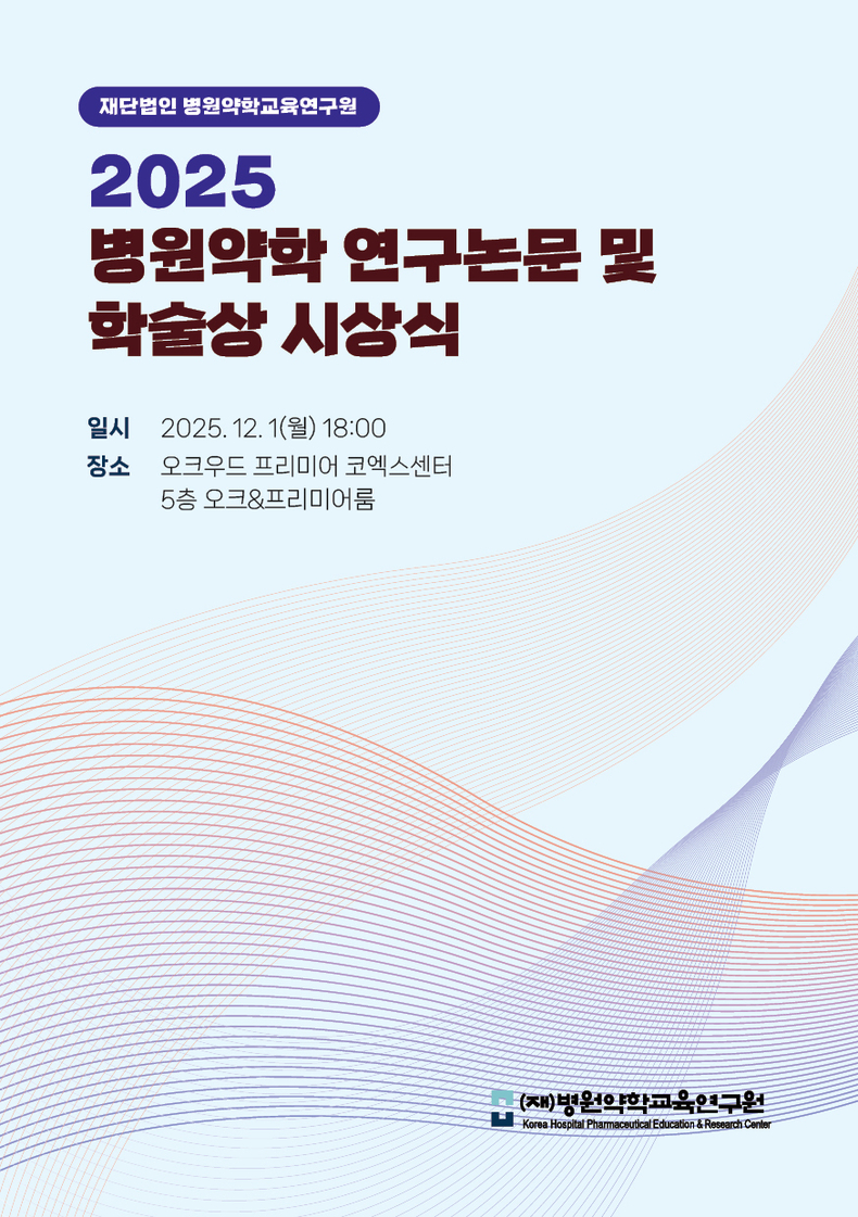 재단법인 병원약학교육연구원(이사장 정경주, 원장 민명숙)은 오는 12월 1일(월) 오후 6시 30분, 오크우드 프리미어 코엑스센터 5층 오크&프리미어룸에서 ‘2025 병원약학연구논문 및 학술상 시상식’을 개최한다. 이날 행사에서는 올해 병원약학연구논문으로 선정된 연구팀에 연구비를 전달하고, 학술상 수상자 4인에 대한 시상이 이어질 예정이다.