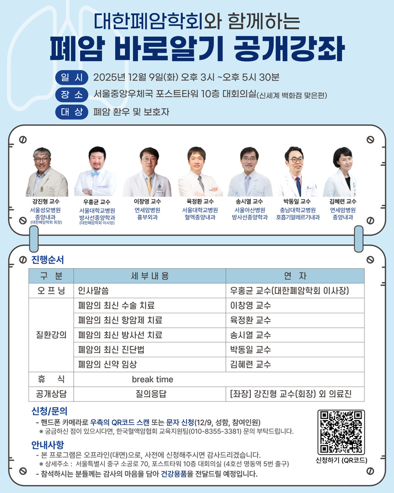 강의가 끝난 뒤에는 대한폐암학회 회장 강진형 교수가 좌장으로 참여해, 환우와 가족이 궁금했던 내용을 직접 질문할 수 있는 질의응답 시간이 진행되며, 이를 통해 의료진과의 보다 깊이 있는 소통이 이뤄질 예정이다.