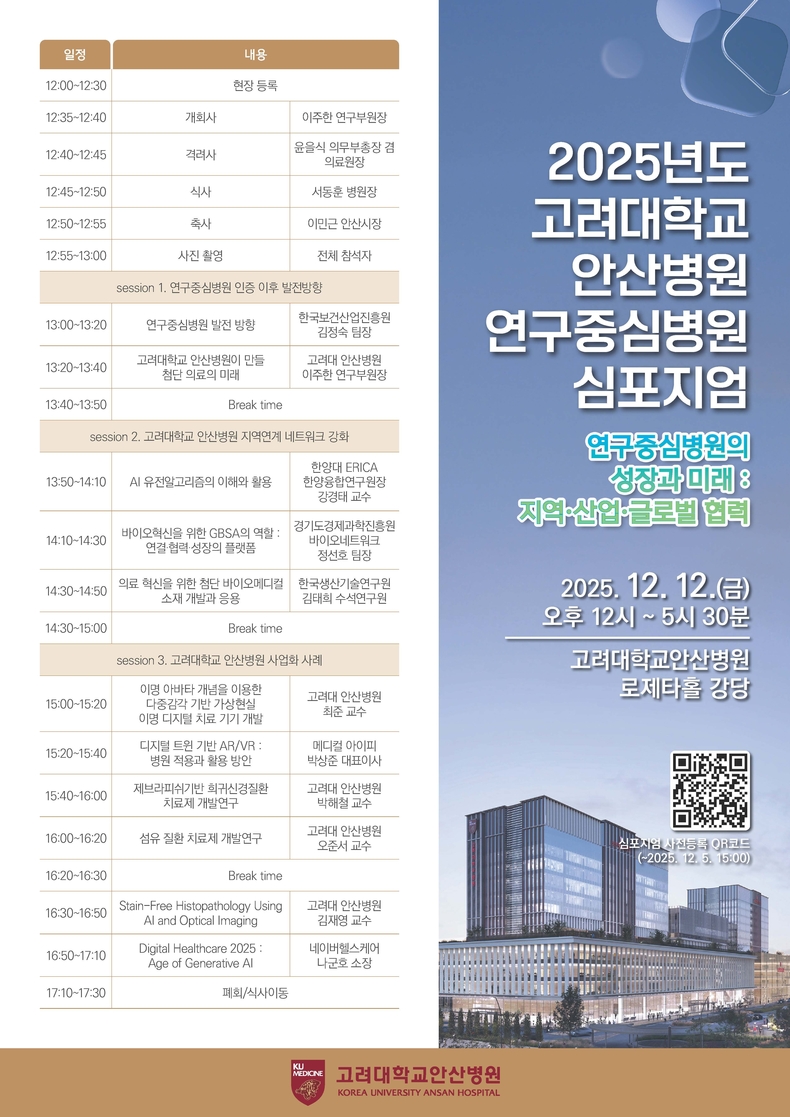 고려대학교 안산병원은 오는 12일 오후 12시, 별관 지하 1층 로제타홀 강당에서 ‘연구중심병원의 성장과 미래 : 지역·산업·글로벌 협력’을 주제로 심포지엄을 개최한다. 이번 행사는 고려대 안산병원이 첫 연구중심병원 인증을 획득한 것을 기념하고, 병원의 연구 경쟁력 강화 및 지역·산업·글로벌 기반 연구 생태계 협력 방안을 논의하기 위해 마련됐다.