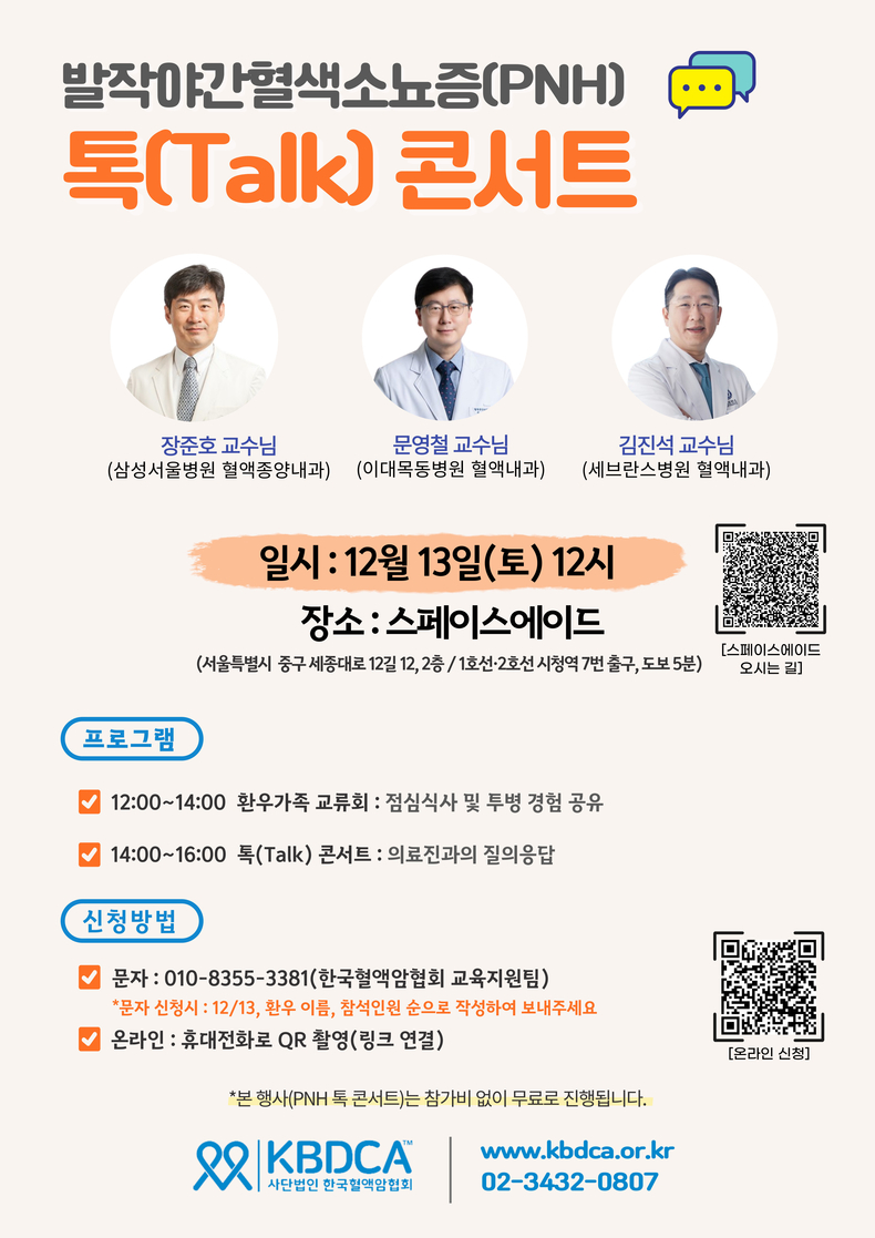 한국혈액암협회(회장 장태평)는 오는 12월 13일(토) 서울 시청역 인근 스페이스에이드에서 발작야간혈색소뇨증(PNH) 환우와 가족을 대상으로 한 톡(Talk) 콘서트를 개최한다.