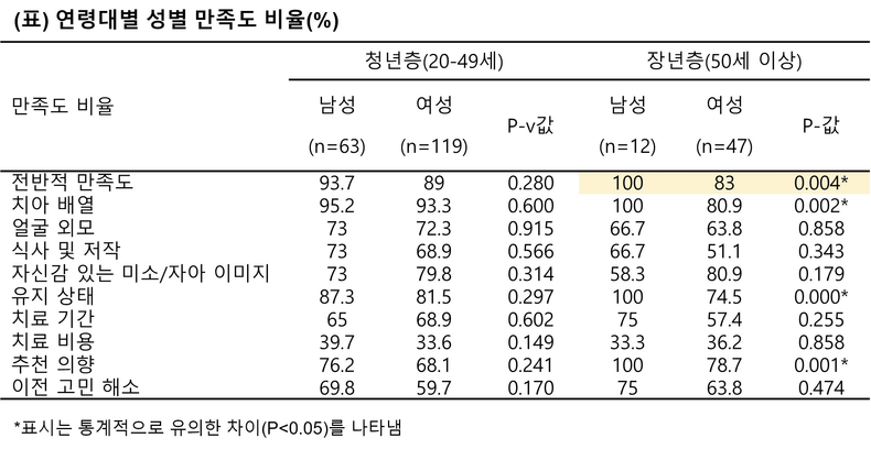 특히 50세 이상 장년층 남성은 치아 배열, 유지 상태 등 전반적인 만족도에서 여성보다 유의하게 높은 만족도를 보였다(P<0.05). 그럼에도 불구하고 여성은 ‘미소 자신감’ 및 ‘자기 이미지 향상’ 항목에서는 남성보다 높은 만족도를 나타내, 심미적 개선에 대한 긍정적 자기 평가가 반영됨을 보여주었다.