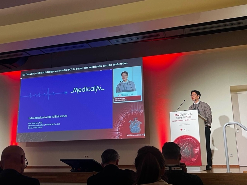 지난달 21일 독일 베를린에서 열린 ESC Digital & AI Summit 2025에서 메디컬에이아이는 스마트워치로 측정한 심전도를 분석하는 AI 솔루션의 현장 시연을 비롯해, 1건의 구술 발표 및 2건의 포스터 발표를 진행했다. 특히 구술 발표는 경쟁 심사를 거쳐 소수의 연구자에게만 발표 기회를 제공한 세션으로, 메디컬에이아이의 심전도 분석 인공지능 기술은 그 혁신성을 인정받고 채택됐다.