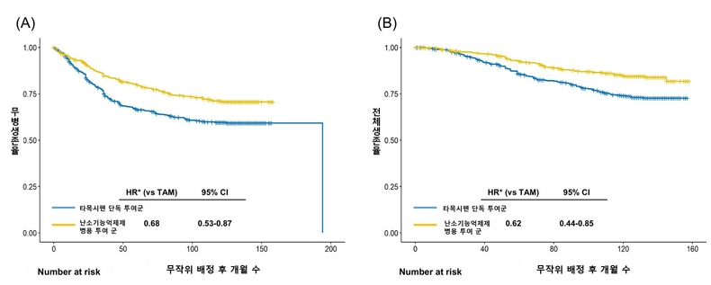 연구 결과, 항호르몬제 치료와 난소기능 억제 치료를 동시에 받은 그룹이 항호르몬제 단독 치료 그룹보다 예후가 유의하게 양호하다는 결과가 나왔다. 환자 치료 후 10년 동안 재발 여부를 알아보는 ‘10년 무질병 생존율’에서 동시 치료 그룹은 70.9% 생존율을 보였고, 단독 치료 그룹은 59.6%에 그쳤다(P〈0.001). 환자가 치료 후 사망에 이르기까지 과정을 모두 살핀 ‘전체생존율’에서도 동시 치료 그룹은 84.7%, 단독 치료 그룹은 74.0%를 나타냈다(P〈0.001).