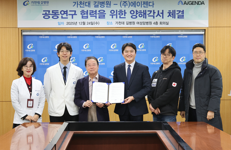 가천대 길병원과 에이젠다는 24일 여성암병원 4층 회의실에서 ‘다기관-멀티모달 연합학습 기반 의료인공지능 기술 시범모델 개발(FLAME-ARK)’ 사업의 성공적인 수행을 위한 업무협약(MOU)을 체결했다고 밝혔다. 이날 협약식에는 가천의생명융합연구원 정명희 원장, 선우웅상 연구부원장을 비롯해 관계자와 에이젠다 안효인 대표가 참석했다.