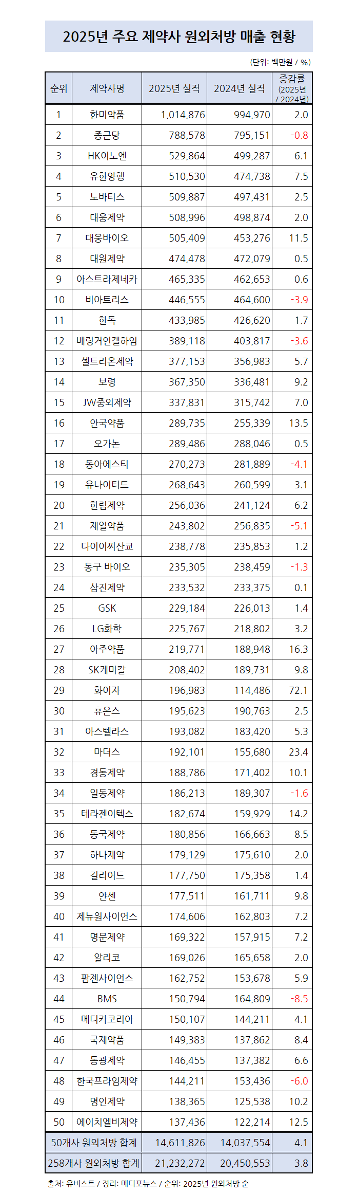 유비스트에 따르면 매출 상위 50위 제약사들의 원외처방액은 2024년 14조 375억원에서 2025년 14조 6118억원으로 4.1% 증가했다. 2025년 매출이 집계된 258개사 전체적으로는 2024년 20조 4505억원에서 2025년 21조 2322억원으로 3.8% 상승한 것으로 나타났다.
