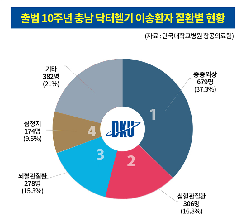 단국대병원 항공의료팀이 충남 닥터헬기 이송환자 1,819명을 분석한 결과, 질환으로 인한 환자가 1,068명(58.7%), 외상환자가 751명(41.3%)으로 나타났다. 세부 질환별로는 중증외상 환자가 679명(37.3%)으로 가장 많았고, 심혈관질환 306명(16.8%), 뇌혈관질환 278명(15.3%), 심정지 174명(9.6%) 순이었다. 이 밖에도 추락·교통사고, 다발성 골절, 위장관 출혈, 호흡곤란, 제초제 등 약물중독, 자살 시도 등 촌각을 다투는 기타 중증응급환자가 382명(21.0%)에 달했다.