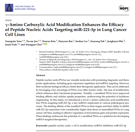 HLB파나진은 자사가 개발한 감마-아미노카르복실산(γ-ACA) 변형 PNA 연구 결과가 SCI(E)급 국제학술지 '커런트 이슈 인 몰레큘러 바이올로지(Current Issues in Molecular Biology)'에 출간됐다고 밝혔다. γ-ACA 변형은 PNA 골격을 구조적으로 개선해 표적 유전자와의 결합력을 높이고, 억제 효율을 향상시키는 기술이다.