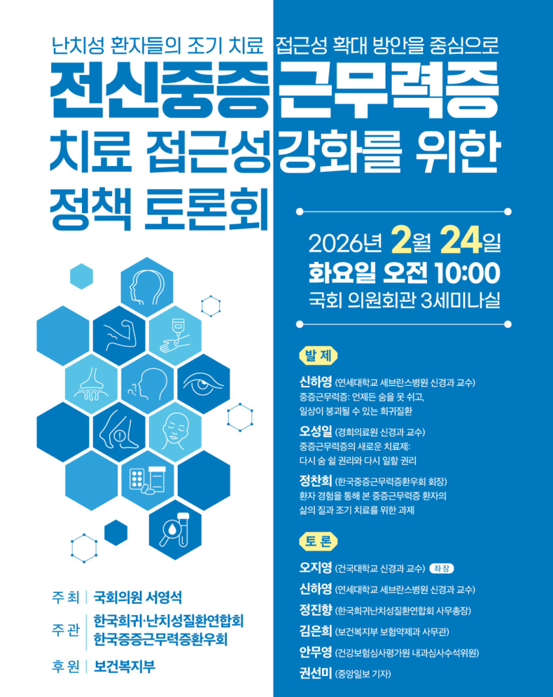 서영석 더불어민주당 의원(국회 보건복지위원회, 경기 부천시갑)이 주최하고 (사)한국희귀·난치성질환연합회와 한국중증근무력증환우회가 주관하는 ‘전신 중증근무력증(MG) 치료 접근성 강화를 위한 정책 토론회’가 오는 24일(화) 오전 10시, 국회의원회관 제3세미나실에서 개최된다. 이번 토론회는 보건복지부가 후원한다.