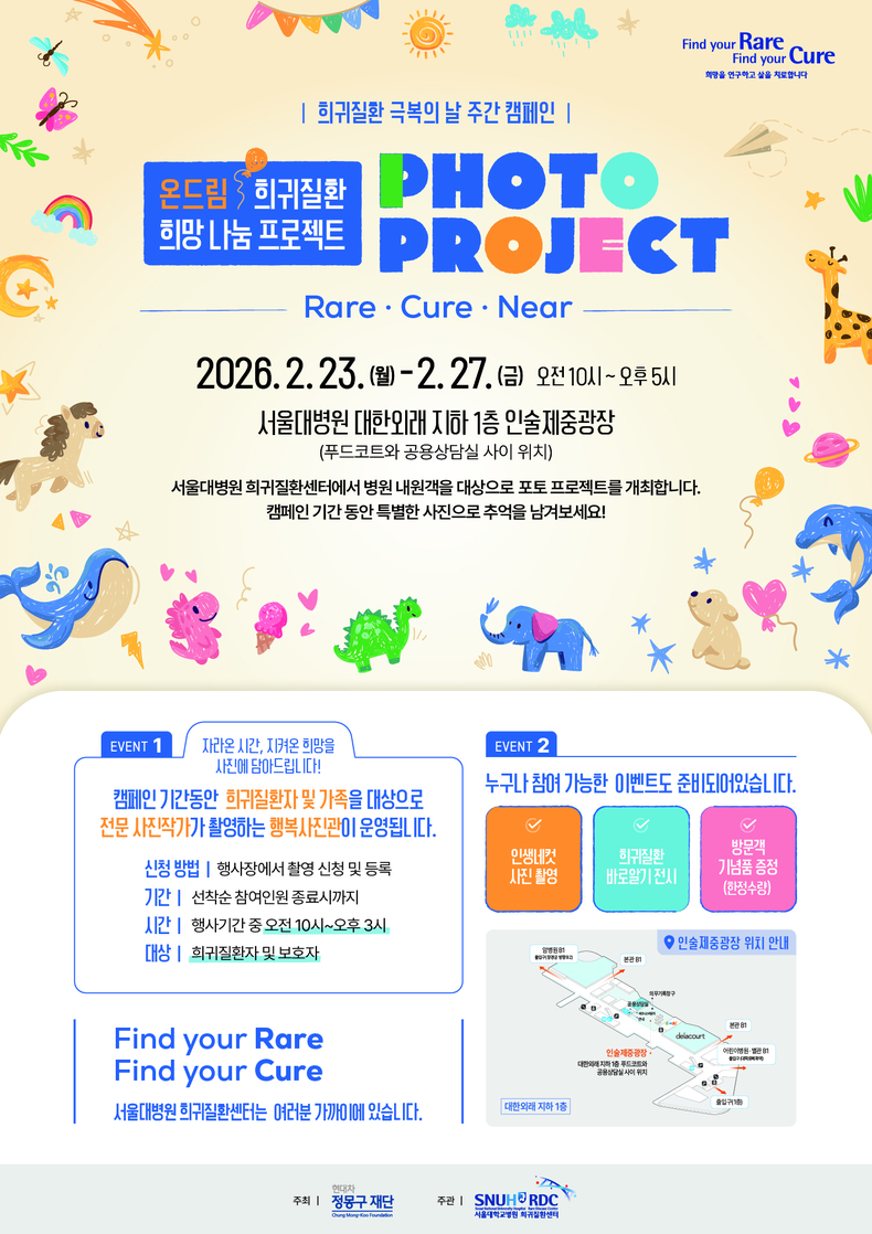 이번 프로젝트는 ‘Rare·Cure·Near’를 핵심 키워드로, 희귀질환 환자와 가족이 전문 사진작가와 함께 가족사진을 촬영해 소중한 순간을 기록하고, 병원을 찾은 방문객과 의료진의 희귀질환 이해를 높이기 위해 기획됐다.