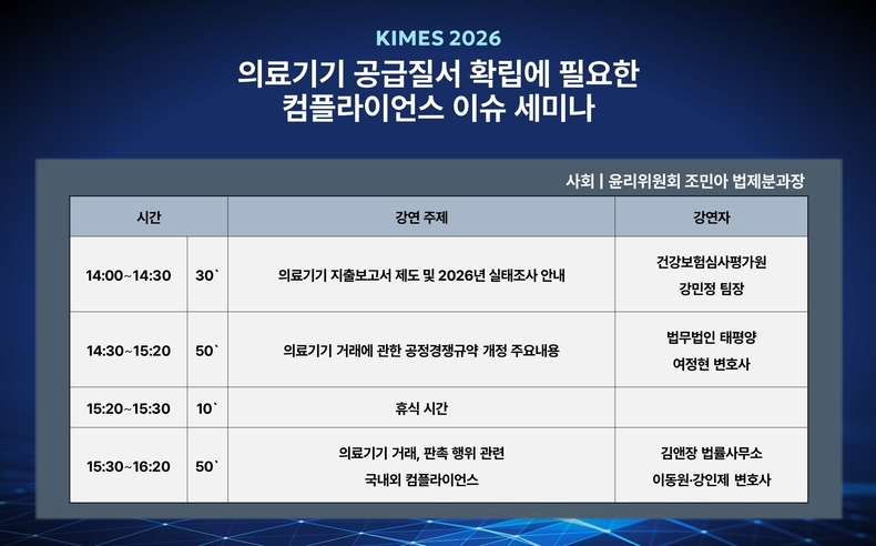 한국의료기기산업협회(회장 김영민)는 윤리위원회(위원장 정병헌) 주관으로 3월 19일(목) 오후 2시 서울 코엑스 컨퍼런스룸 402호에서 ‘KIMES 2026 의료기기 공급질서 확립에 필요한 컴플라이언스 이슈’ 세미나를 개최한다고 밝혔다.