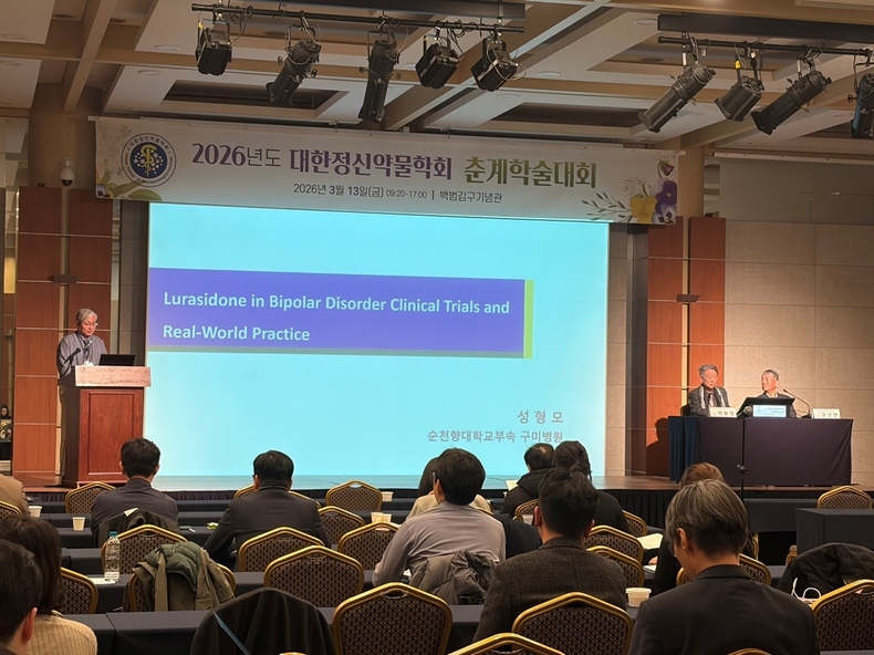 첫 번째 강연자로 나선 천안순천향의대 성형모 교수는 양극성 장애 임상 시험과 실제 임상 현장에서 루라시돈(제품명: 라투다)이 갖는 치료적 가치를 조명했다. 성 교수는 루라시돈의 독특한 수용체 결합 프로파일이 치료 효과의 핵심임을 강조했다.