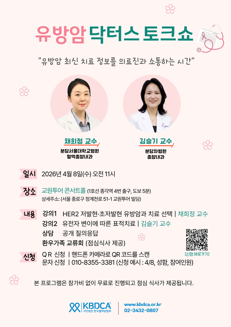 한국혈액암협회(회장 장태평)는 오는 4월 8일(수) 오전 11시, 서울 종로구 교원투어 콘서트홀에서 유방암 환우와 가족을 대상으로 전문 건강 강좌 및 ‘닥터스 토크쇼’를 개최한다.