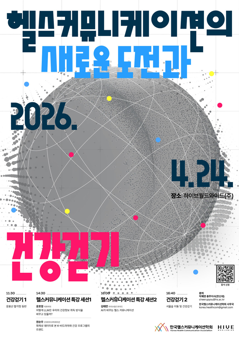 한국헬스커뮤니케이션학회(회장 김활빈, 강원대 미디어커뮤니케이션학과 교수)는 오는 4월 24일(금) 하이브 월드와이드에서 ‘New Challenges in Health Communication and Walking for Health’를 주제로 2026년 제2차 세미나를 개최한다고 밝혔다.