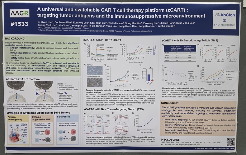 앱클론이 미국 샌디에이고에서 열리고 있는 ‘미국암연구학회(AACR) 2026’에서 한국 시간 21일 새벽 1시부터 4시까지 차세대 혁신 항암 치료 플랫폼인 ‘zCAR-T’와 전립선암 타깃 이중항체 신약 후보물질 ‘AM109’의 최신 연구 데이터를 성공적으로 발표했다고 21일 밝혔다.