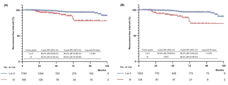 연구 결과, 전체 환자군에서 조직학적 등급이 높을수록 재발을 겪지 않고 지내는 기간(RFI : recurrence-free interval)이 짧아지는 것으로 확인됐다(P < 0.001). 이 현상은 아직 폐경을 겪지 않은 50세 이하 환자군에서는 고등급 환자들이 저등급 및 중간 등급 환자보다 재발 없이 지내는 기간이 확연하게 짧았다(P < 0.001), 50세를 초과한 환자군에서는 고등급 환자들이 저등급 또는 중간 등급 환자들과 큰 자이를 보이지 않는 특징이 관찰됐다.