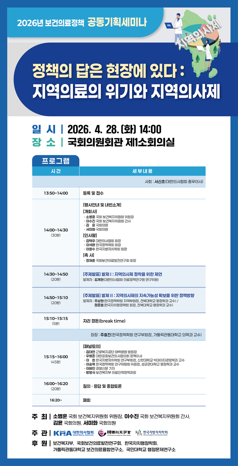 대한의사협회(회장 김택우)는 오는 4월 28일(화) 오후 2시 국회의원회관 제1소회의실에서 국회 보건복지위원회 소병훈 위원장, 이수진 간사, 김윤 의원, 서미화 의원과 뜻을 모아 ‘2026년 보건의료정책 공동기획세미나’를 개최한다.