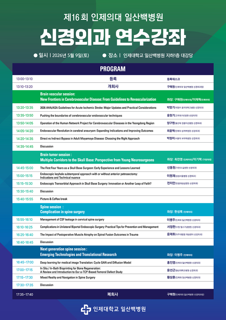 인제대학교 일산백병원은 오는 5월 9일 병원 대강당에서 ‘제16회 신경외과 연수강좌’를 개최한다.