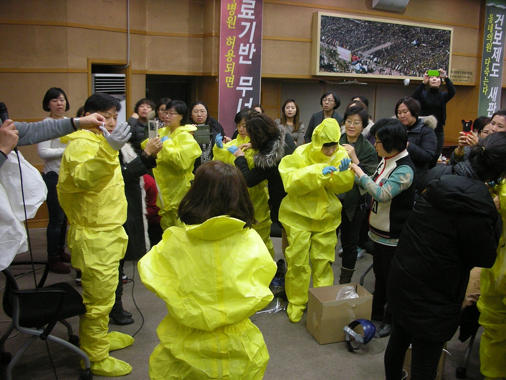 대한의사협회(회장 추무진)는 대한간호협회(회장 김옥수)와 공동으로 “에볼라 바이러스병 이론교육 및 보호장구 착용 실습관련 연수교육”을 지난 1월 30일 의협에서 실시했다고 밝혔다.
