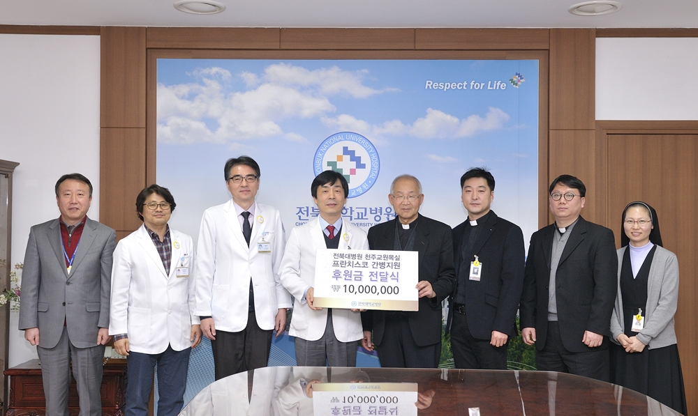 전북대학교병원은 천주교 전주교구 이병호 주교와 병원내 천주교원목실 전우진 신부 등이 정성후 병원장을 방문해 성금 1000만원을 전달했다고 10일 밝혔다.