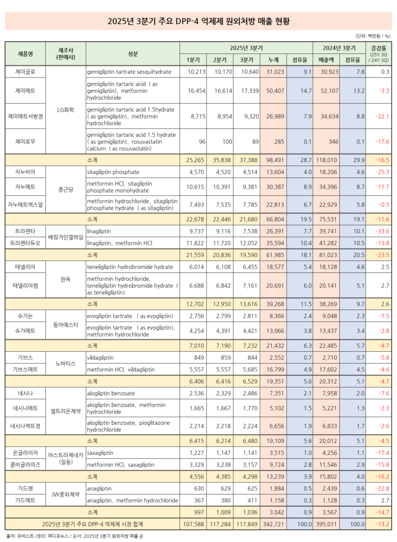 의약품 시장조사기관 유비스트에 따르면, 2025년 3분기 주요 DPP-4 억제제 원외처방 시장은 2024년 3분기 3950억원에서 2025년 3분기 3427억원으로 13.2% 감소했다.