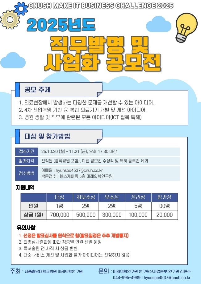 세종충남대학교병원은 전 직원을 대상으로 제5회 직무발명 및 사업화 공모전(CNUSH Make it business Challenge 2025)을 개최한다고 23일 밝혔다.