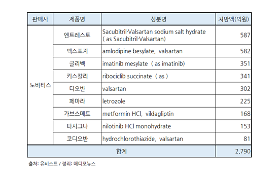 엔트레스토가 587억원, 엑스포지가 582억원, 글리벡이 351억원, 키스칼리 341억원, 디오반이 302억원, 페마라가 225억원, 가브스메트가 168억원, 타시그나가 153억원, 코디오반이 81억원을 기록했다.