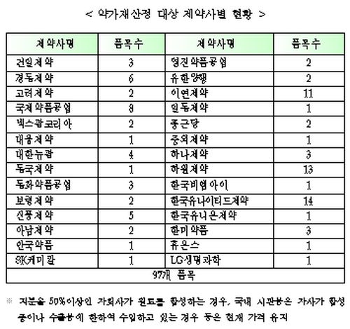 의약품의 원료를 수입하지 않고 국내에서 직접 합성하면 건강보험에서 높은 가격을 인정해 주는 것을 이용하여 우선 ‘원료합성’으로 허가를 받아 높은 약가를 받고 나중에 ‘원료수입’으로 이를 변경한 것이 드러난 97개 품목의 보험 약가가 일제히 인하된다.