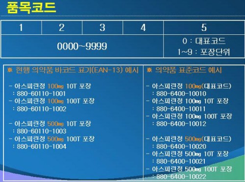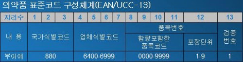 오는 2008년 1월부터 시행하게 되는 의약품 표준코드는 현행 의약품 바코드와 건강보험급여의약품 제품코드(EDI코드)를 통합하기 위해 고안된 코드로 국가코드(3자리), 업체코드(4자리), 품목코드(5자리), 검증번호(1자리)로 구성된다.