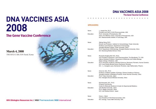 VGX인터내셔널의 자회사이자 바이오 CMO(Contract Manufacturing Organization) 전문기업인 (주)BRI (Biologics Resources Inc.)가 주최하고, 미국의 VGX Pharmaceuticals와 VGX 인터내셔널이 공동으로 후원하는 ‘DNA Vaccines Asia 2008’는 오는 3월 4일 리츠칼튼 호텔에서 개최된다.