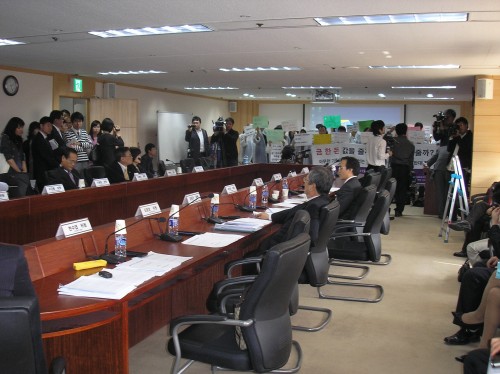 시민단체들의 회의장 점거로 인해 위원회는 개최되지도 못한 채 1시간여 동안 기자회견을 지켜볼 수밖에 없는 상황으로 전개됐다.