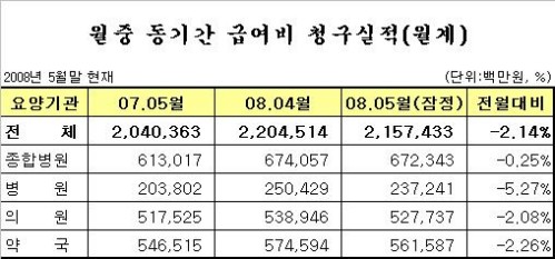 요양기관의 5월 급여비 청구는 2조1500억원으로 지난 4월보다 2.14%가 감소했으며, 종별도 전체적으로 줄어든 것으로 나타났다.
