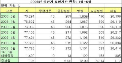 `08년 상반기 요양기관종별 요양병원의 증가율이 전년동기에 비해 32%나 증가한 것으로 나타났다.