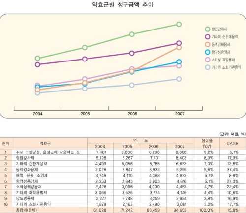 특히 동맥경화용제는 연평균성장율은 37.4%롤 기록하면서, 청구금액 순위가 2004년 10위에서 2007년 4위로 뛰어올랐다.