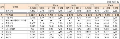 동아제약은 2006년까지 업계 1위를 고수하고 있으나 다른 제약사들이 약진하면서 점유율은 ‘02년 5.7%에서 ’06년 5.0%로 소폭 하락했다.