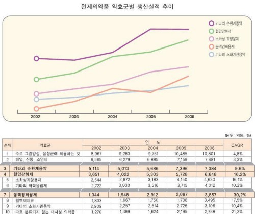 통계정보센터는 “순환계용약으로 분류되는 혈압강하제, 동맥경화용제, 기타의 순환계용약 등의 생산실적이 시장의 연평균성장율(CAGR)을 크게 상회하며 두각을 나타내고 있다”며, “특히 고지혈증치료제가 속한 동맥경화용제 약효군은 최근 5년간 연평균성장율이 30.2%에 이르며 가파른 성장세를 이어 가고 있다”고 설명했다.