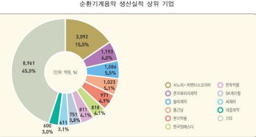 한편, 외국계 제약사가 순환계용약 생산액의 31%를 차지하고, Top10 기업 중 외국계 제약사가 4개사가 포함되어 있는 것으로 볼 때 외국계 제약사의 순환계용약 주력현상은 더욱 뚜렷했다.