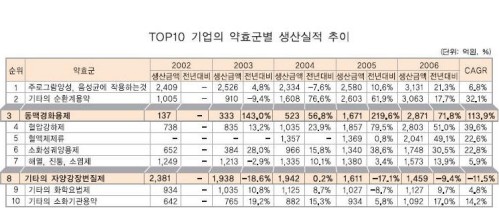 생산실적 Top10 기업의 경우 순환계용약에 주력하는 경향이 더욱 두드러지고 있었다. 순환계용약은 주력약효군의 2위~4위를 차지하며 전체 생산실적의 27.6%를 차지하면서, 2002년 이후 연평균성장율이 46.38%로 시장전체 연평균성장율(7.8%)을 크게 상회했다.