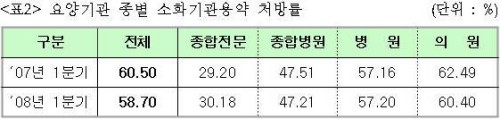 요양기관 종별 소화기관용약 처방률을 보면 `08년 1분기 전체 58.70%로 `07년 1분기 전체 60.50%보다 감소했다. 요양기관종별로 보았을 때 종합전문 병원을 제외한 모든 기관이 감소한 것으로 나타났다.