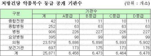 한편, 처방건당 약품목수 등급은 종합전문요양기관, 종합병원, 병원, 의원 표시과목으로 구분한 동일 평가군 별로 상병구성을 보정해 상대평가 방식으로 분류했다.