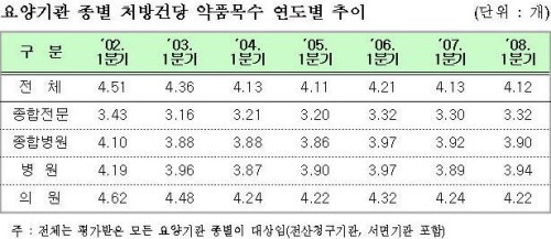 심평원이 공개한 `08년 1/4분기 약제급여적정성 평가결과 요양기관의 처방건당 약품목수는 4.12개로 전년 동 분기 대비 0.01개 감소한 것으로 나타났다.