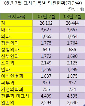 건강보험심사평가원이 공개한 7월말 ‘표시과목별 의원현황’과 ‘요양기관 현황’에 따르면 전문과 미표시 현상이 지속적으로 늘어나고 있었다. 산부인과는 4.6%의 감소세를 기록한 반면 성형외과와 피부과는 5% 이상의 증가세를 보여, 최근의 경영환경을 그대로 반영했다.