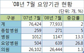 7월말 전국 요양기관종별 현황에 의하면 `07년 7월에 비해 요양기관은 모두 증가했다. 7월말 요양기관은 총 7만7933개 기관으로 전년도 동기간 7만6424개 기관보다 2%가 증가했다.