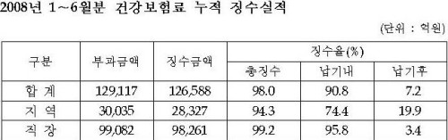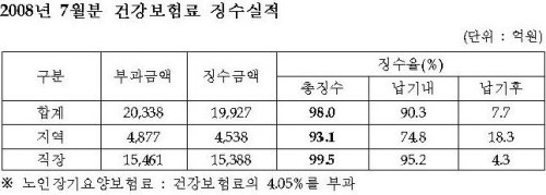 노인장기요양보험료와 함께 부과된 2008년 7월분 건강보험료 징수율이 98%로 나타났다.